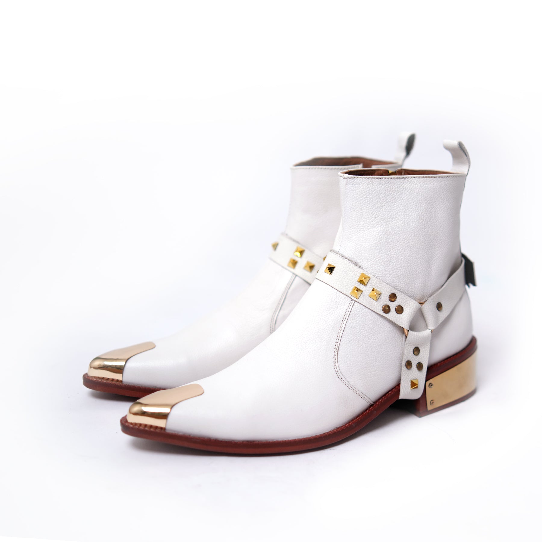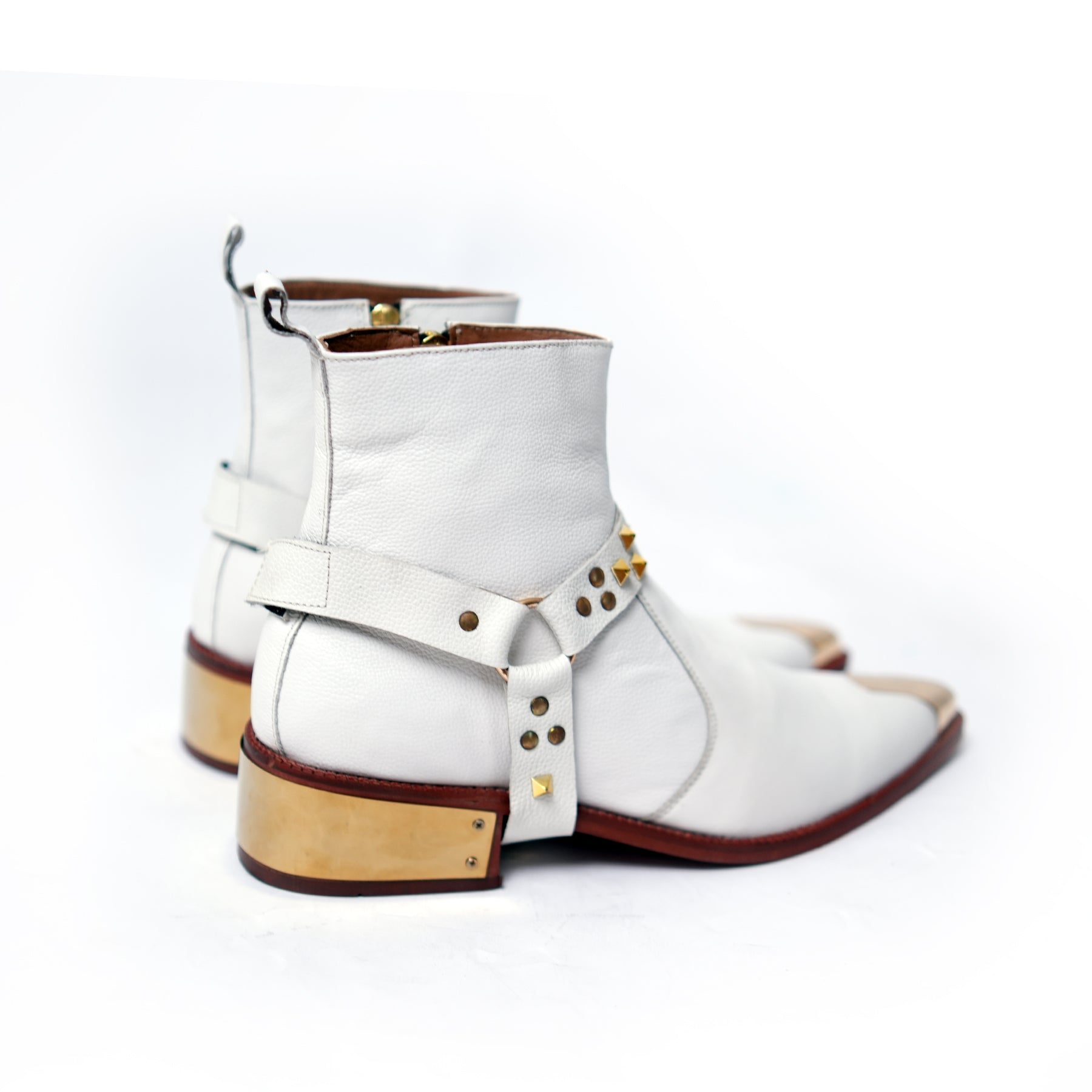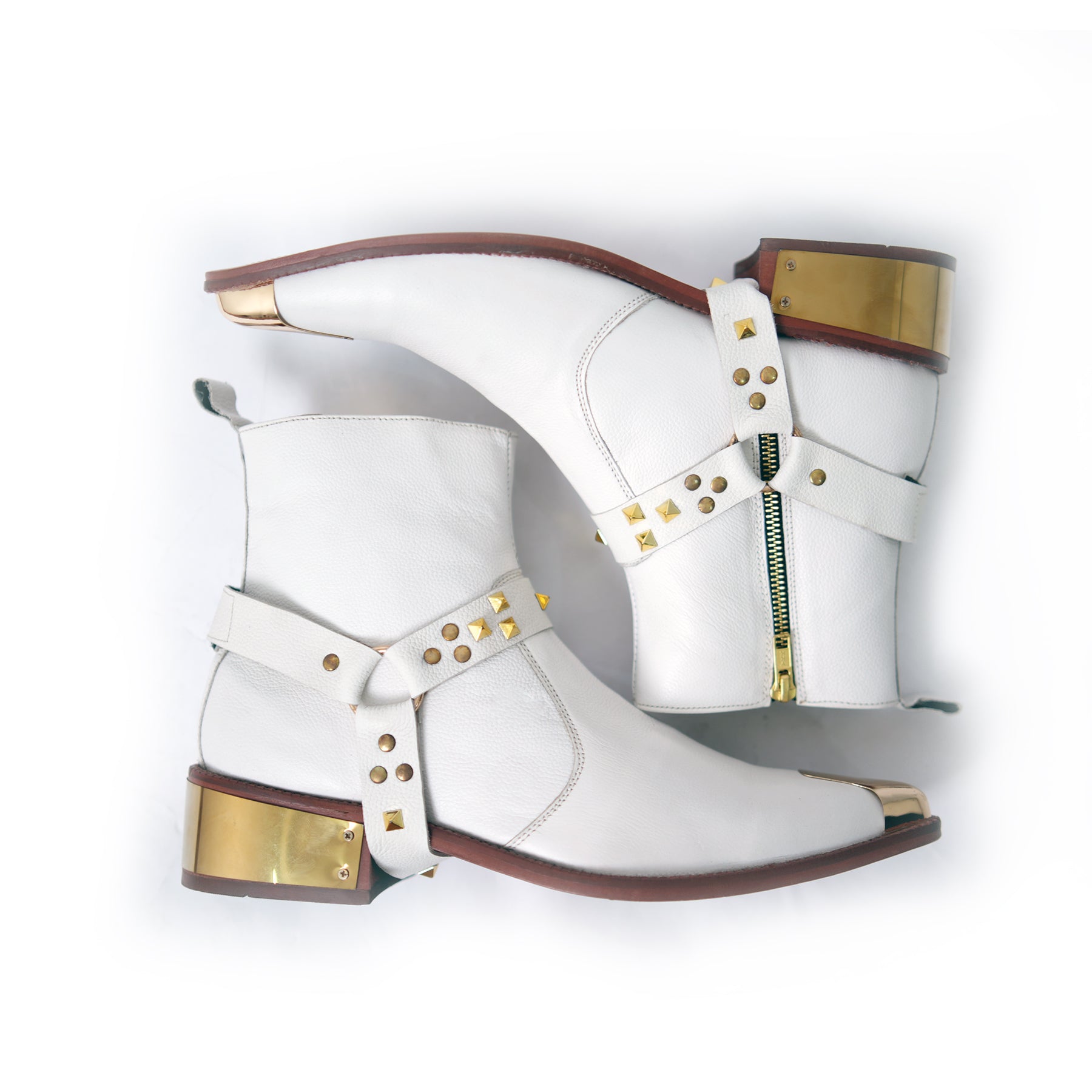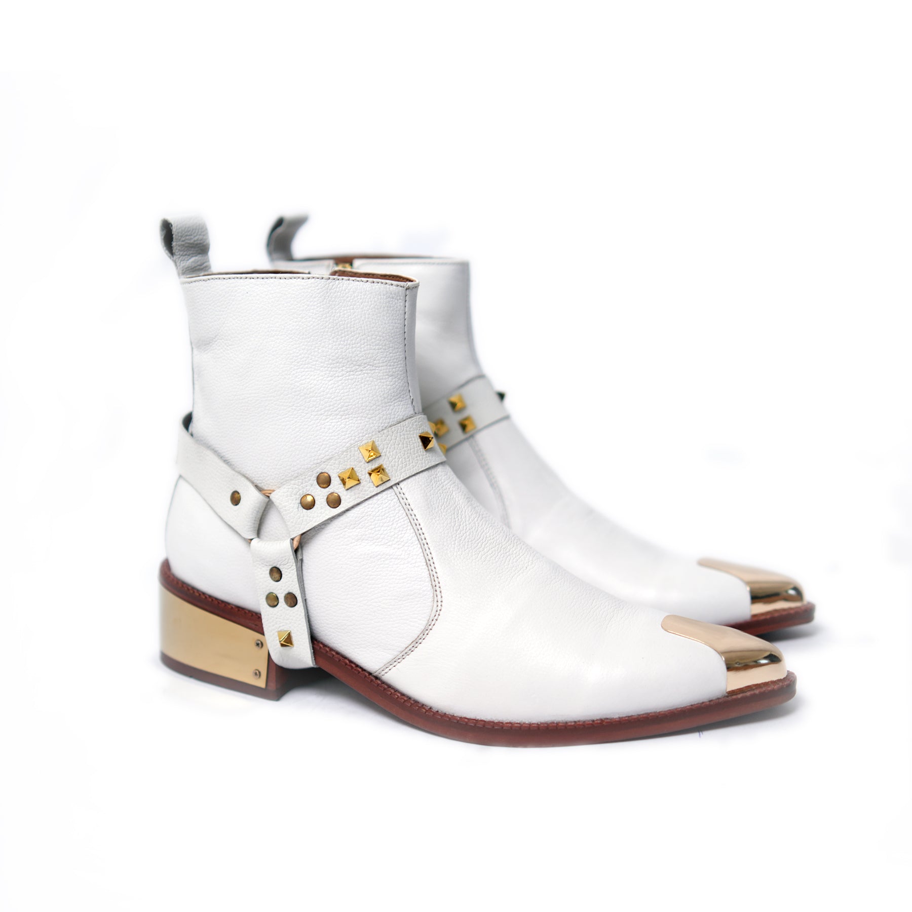 White leather ankle boots with gleaming gold accents and studded straps. A striking mix of elegance and edge, built to turn heads with bold detail.