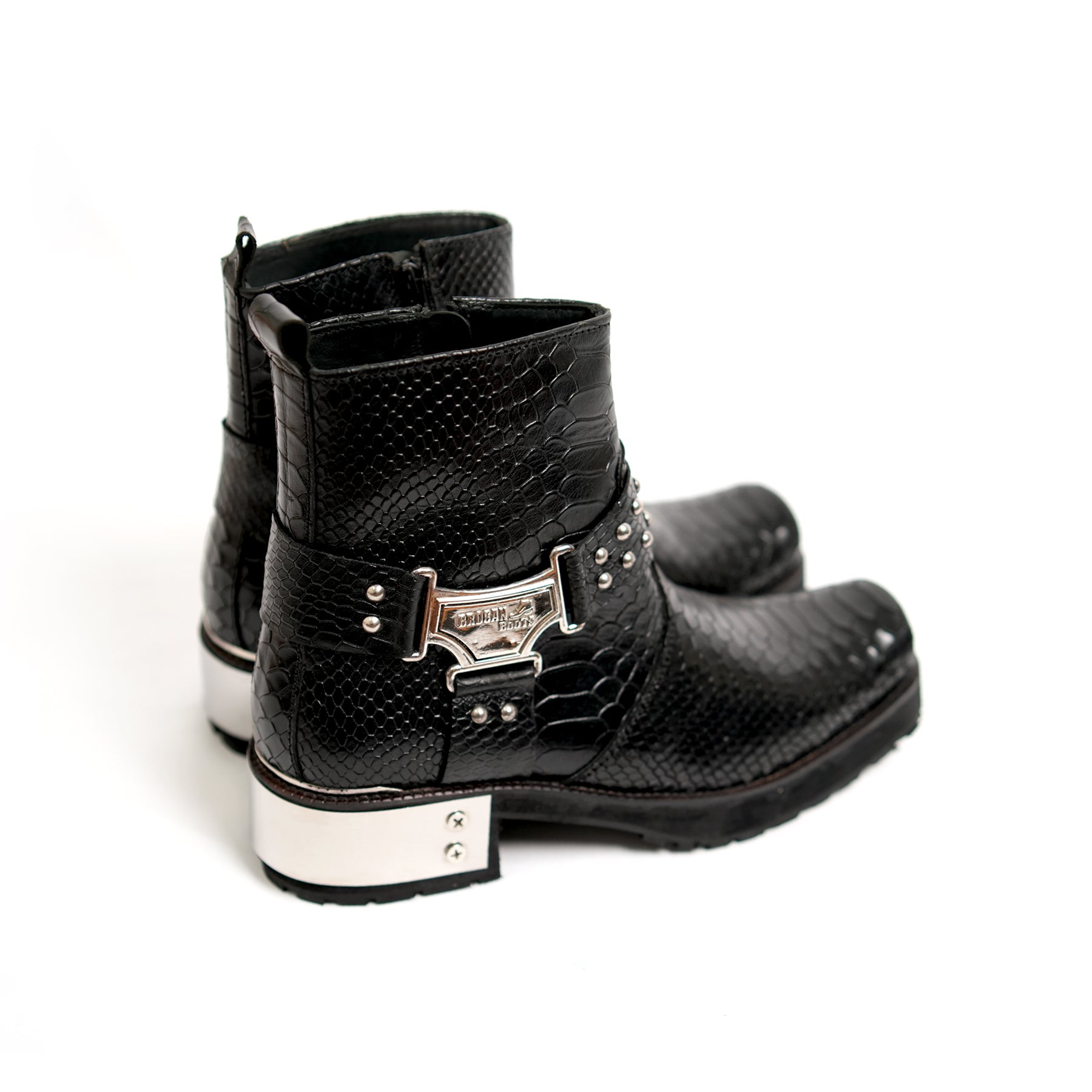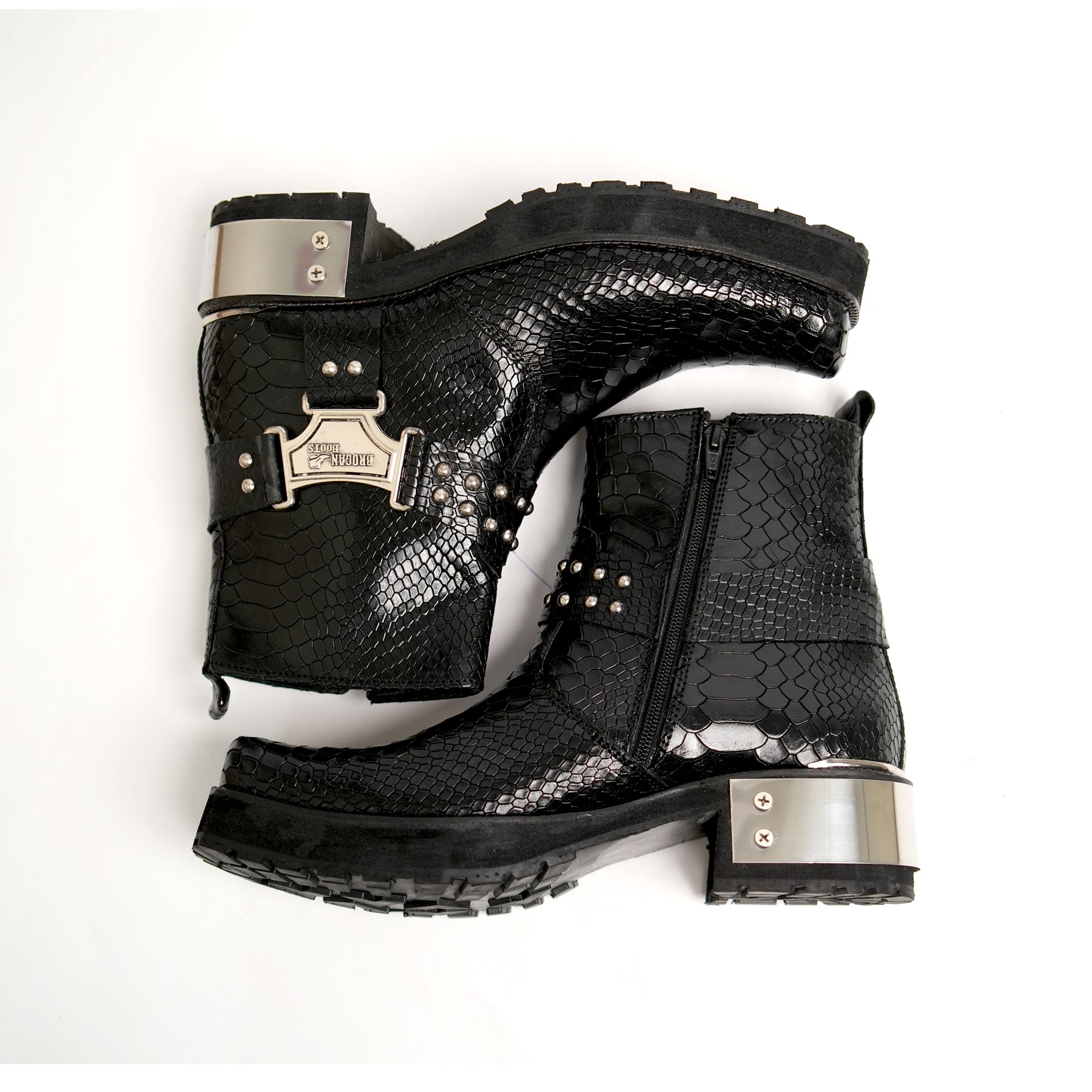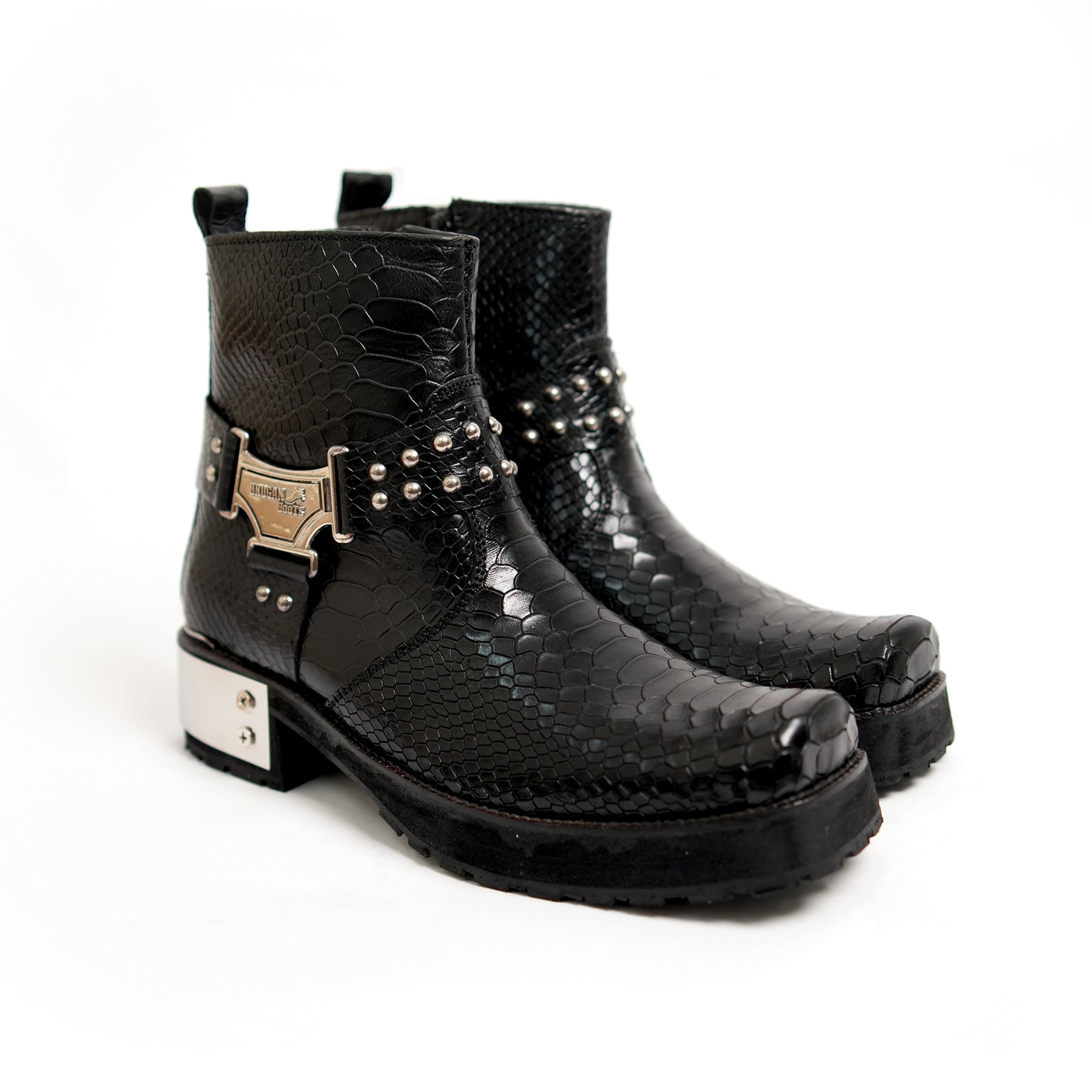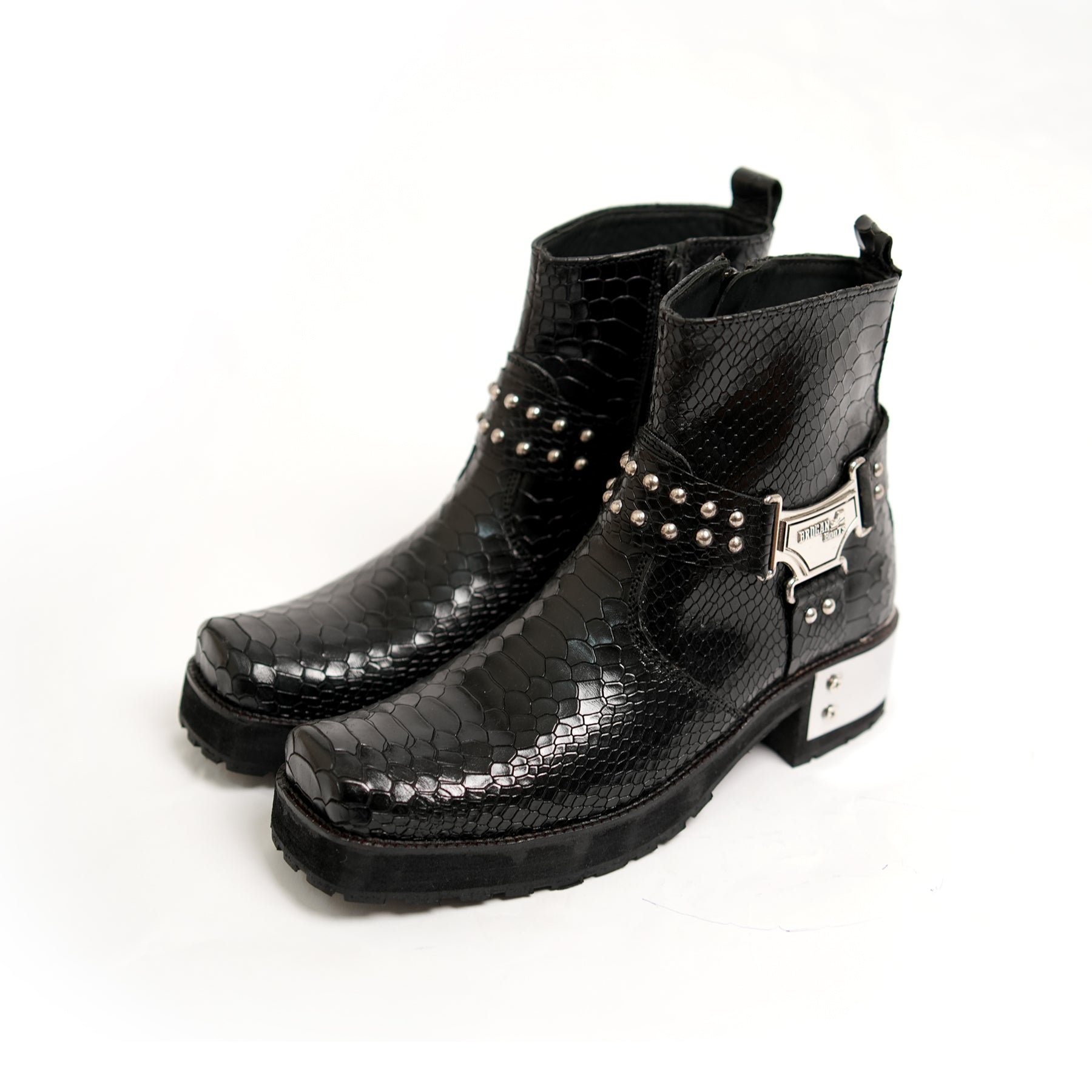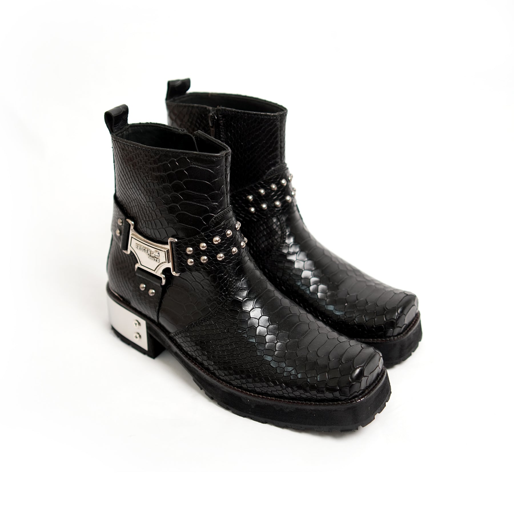 Command attention with this black snakeskin-textured ankle boot, featuring a square toe, studded strap, and engraved silver plate. Rugged sole meets luxe detail—built for bold strides and standout style.