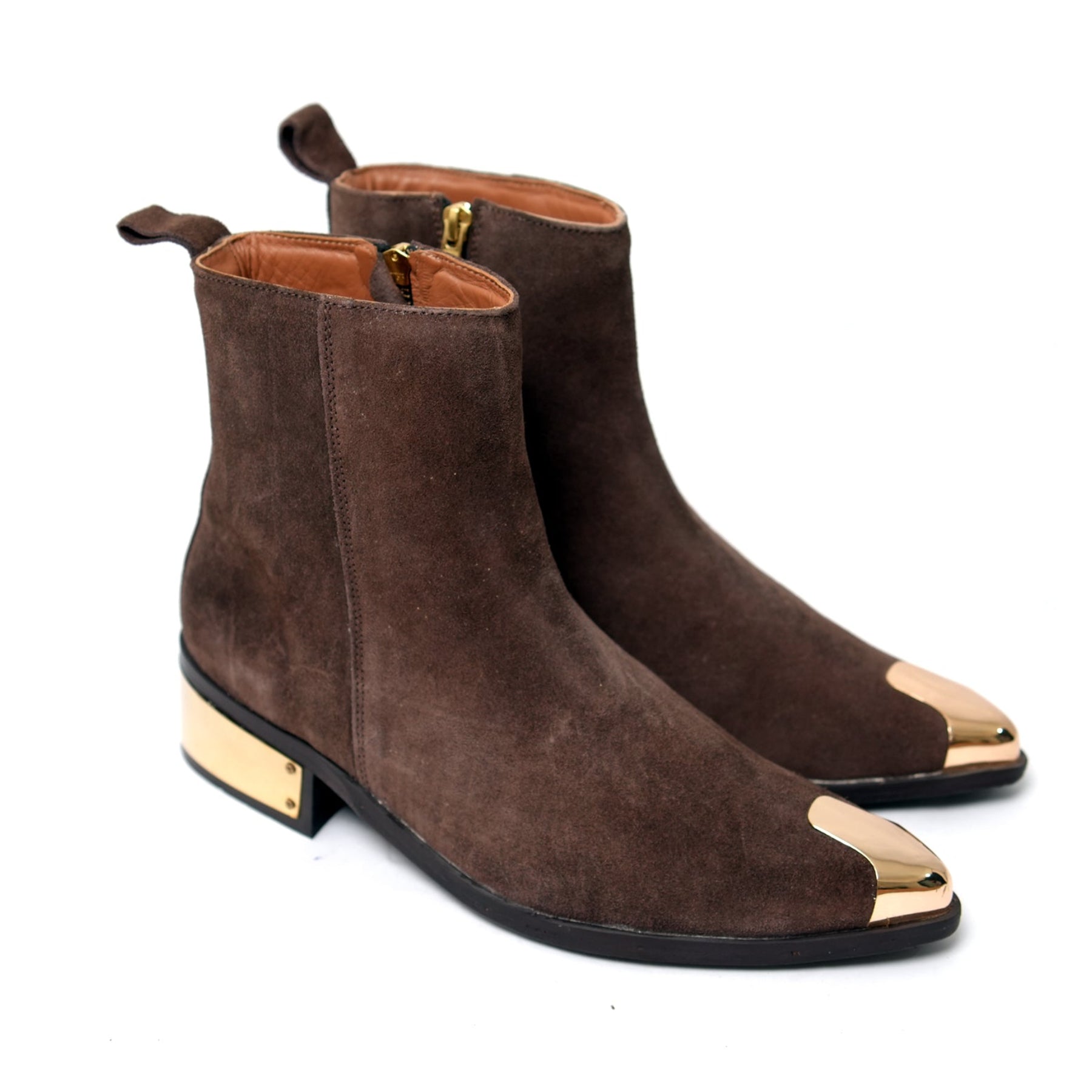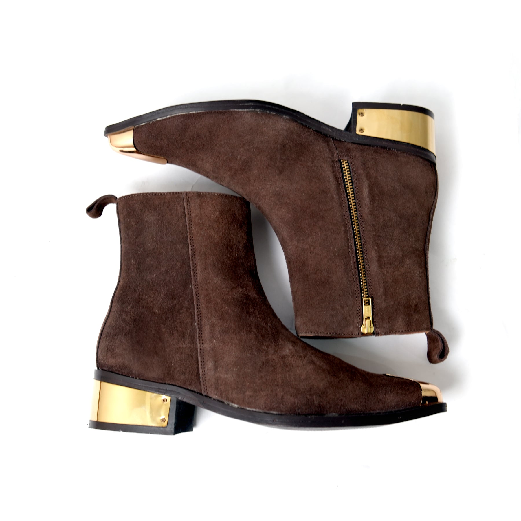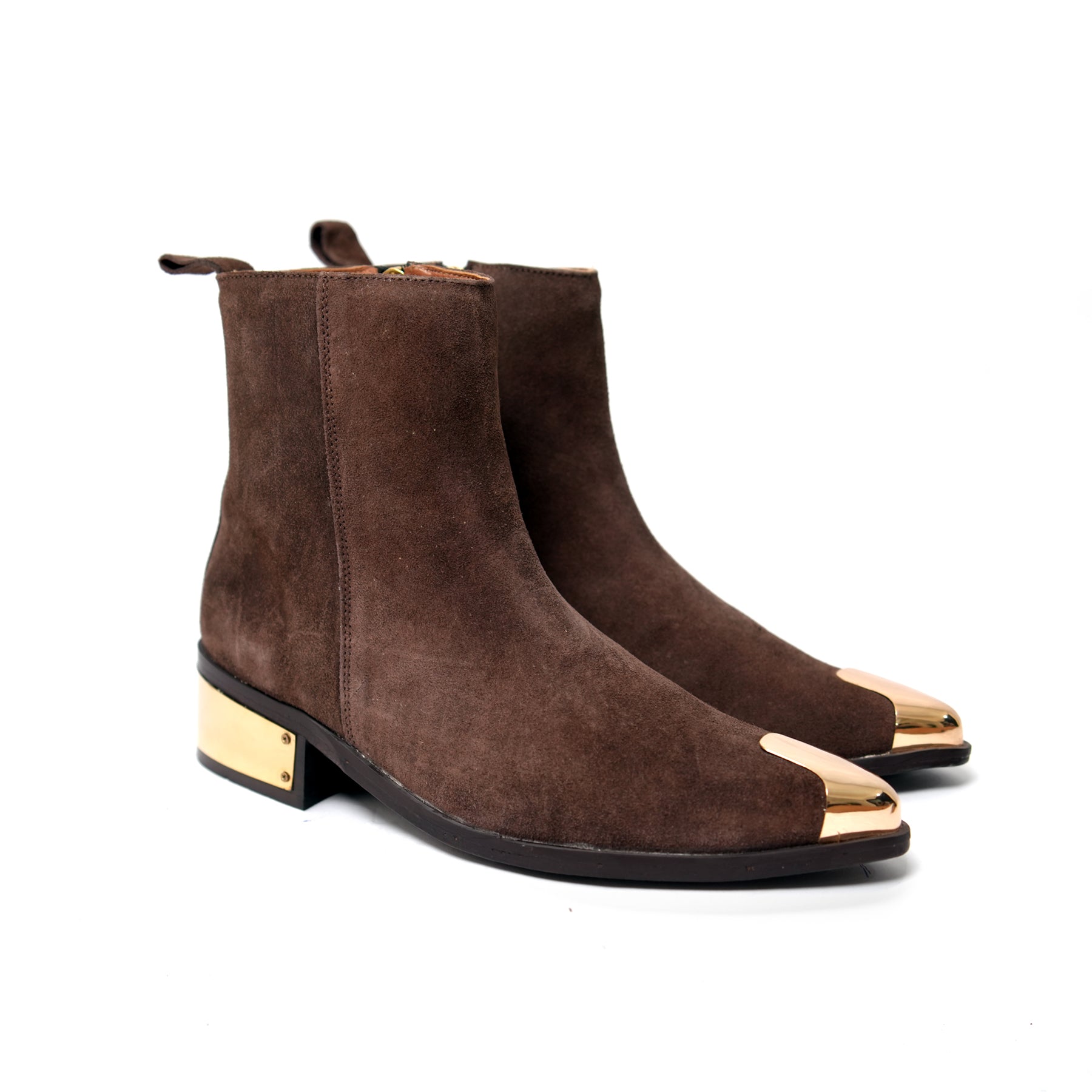 A stylish brown suede ankle boot elevated with metallic gold accents on the toe and heel, combining classic texture with modern edge for a look that’s both luxurious and bold.
