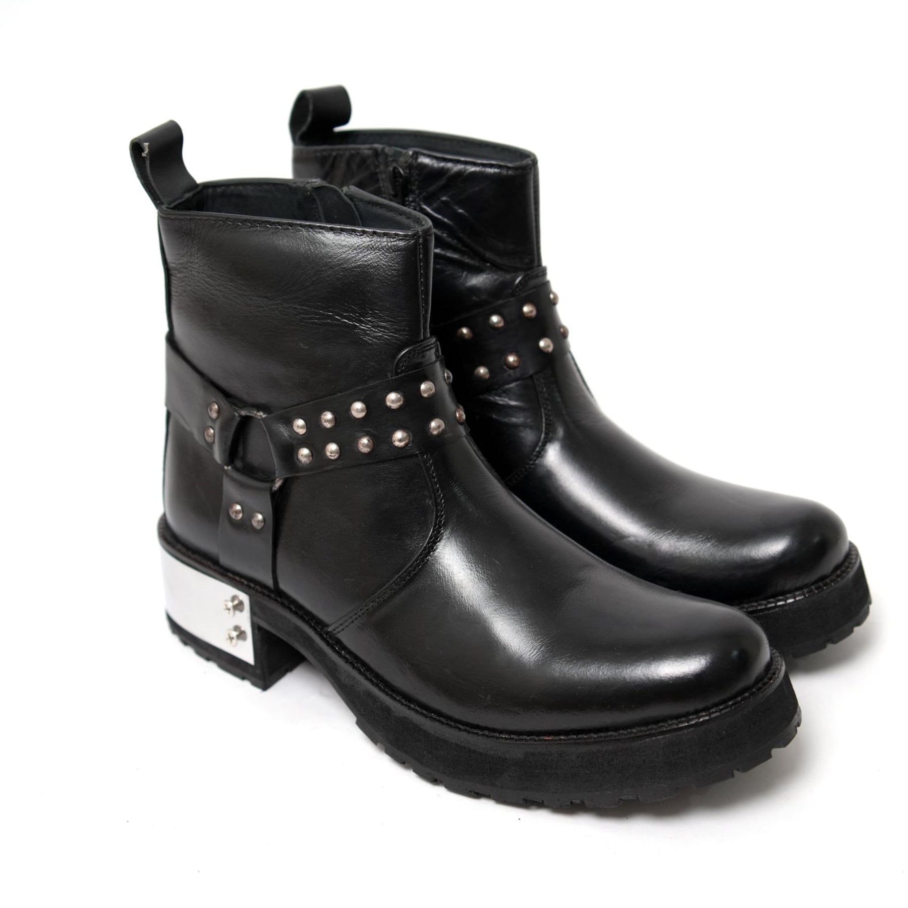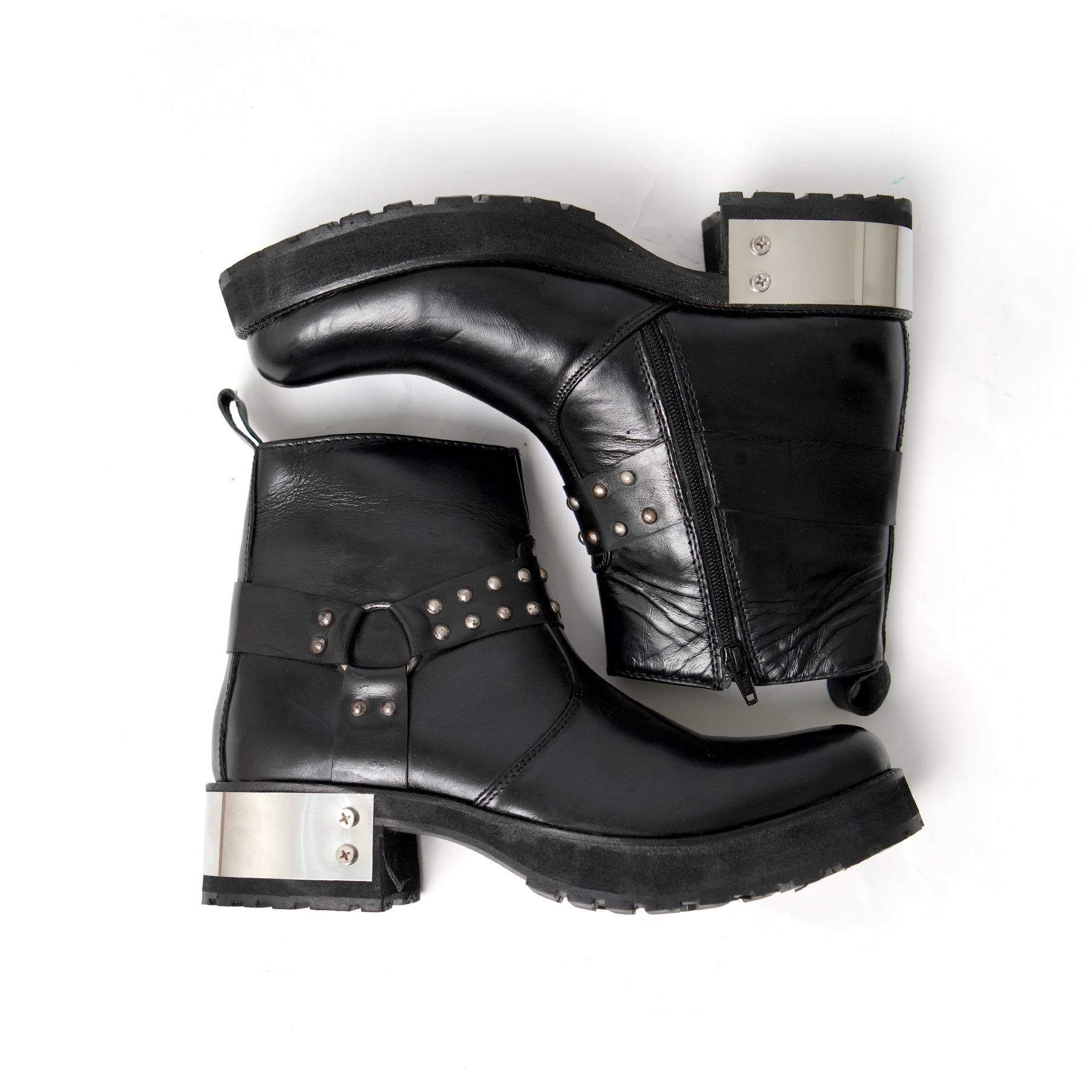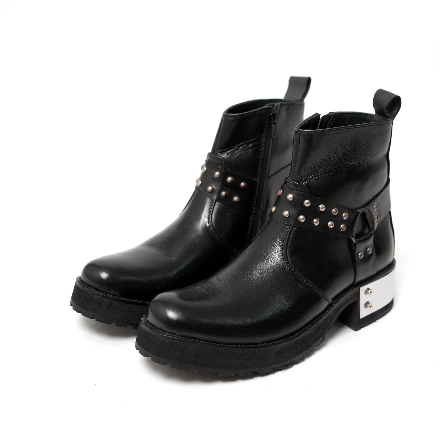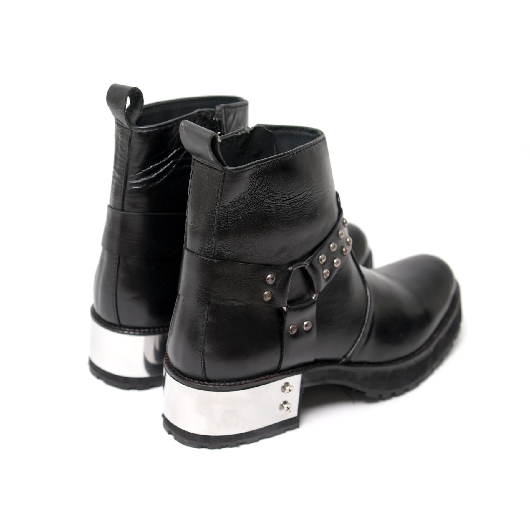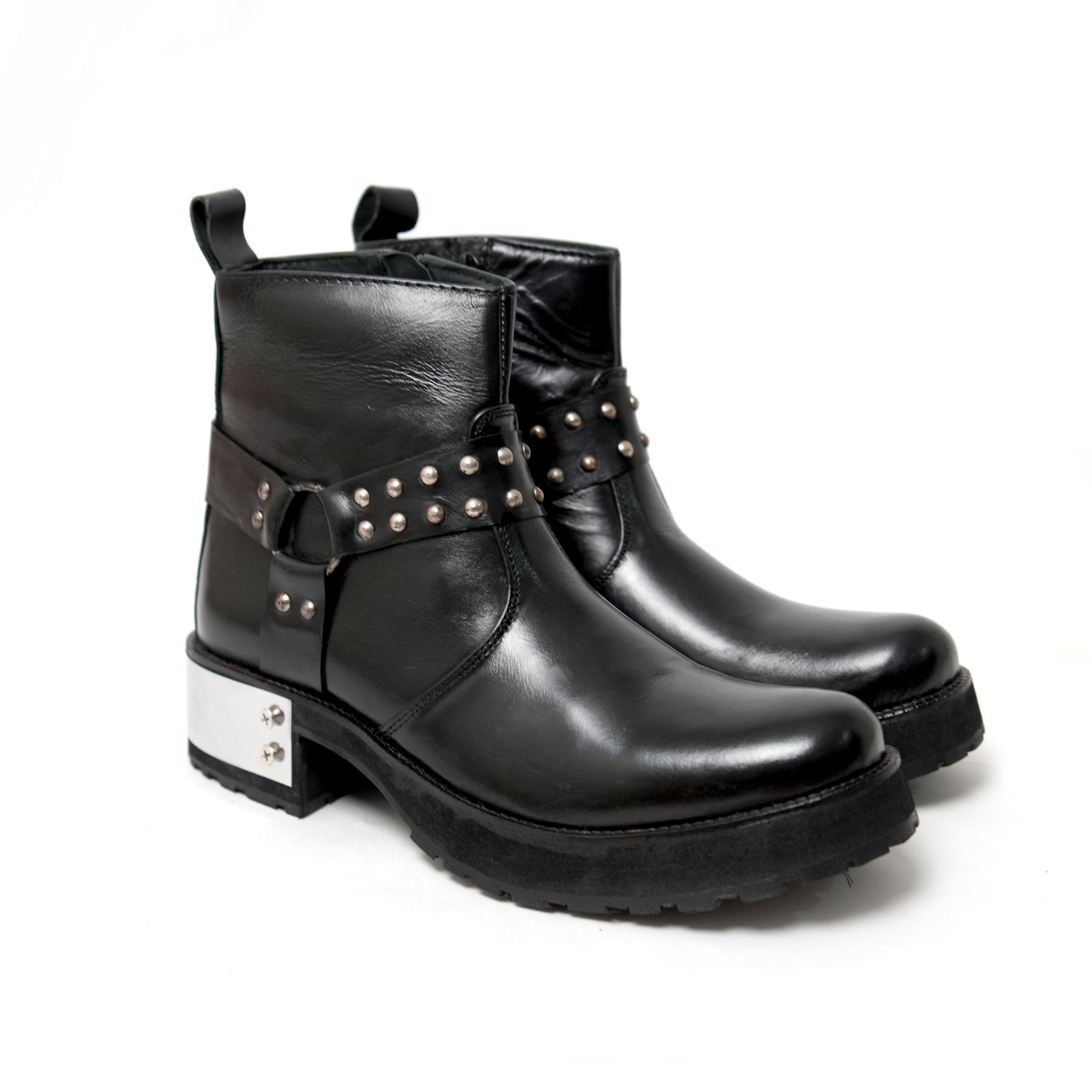 A bold black leather ankle boot with studded straps and a metallic heel accent, built for rugged style and everyday edge.