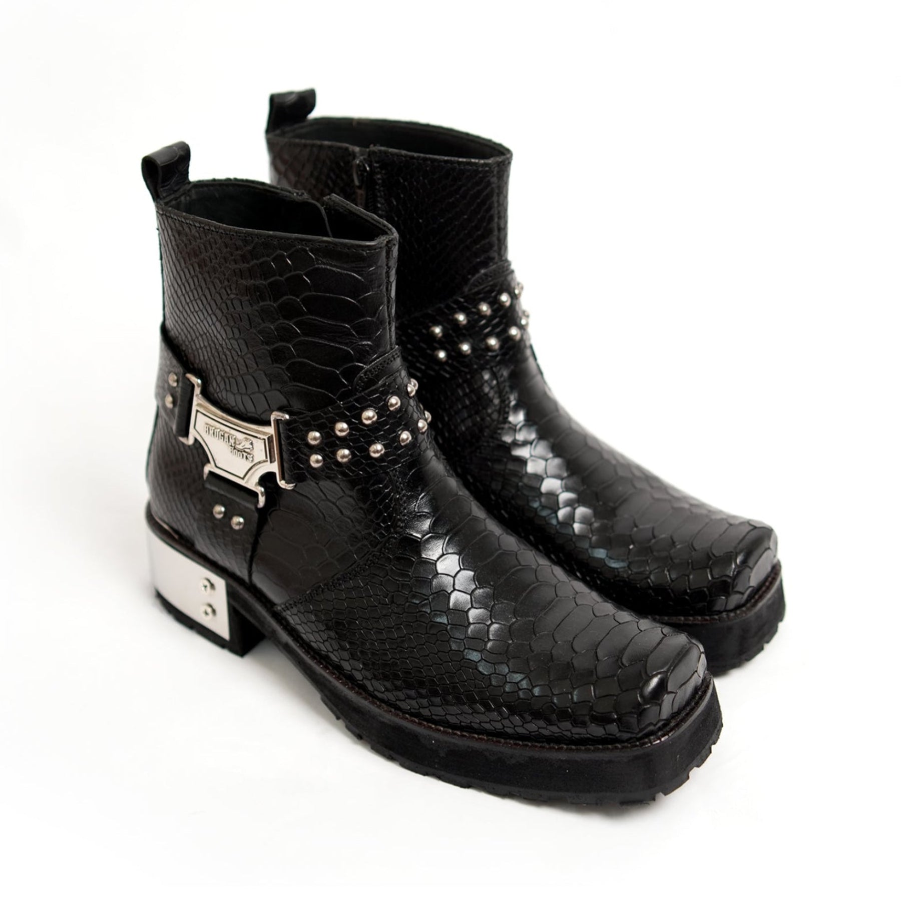 Snakeskin shine, silver hardware, and unapologetic attitude—this boot is pure power dressing. Brogan-stamped and street-sculpted, it’s made to dominate every sidewalk like a runway.