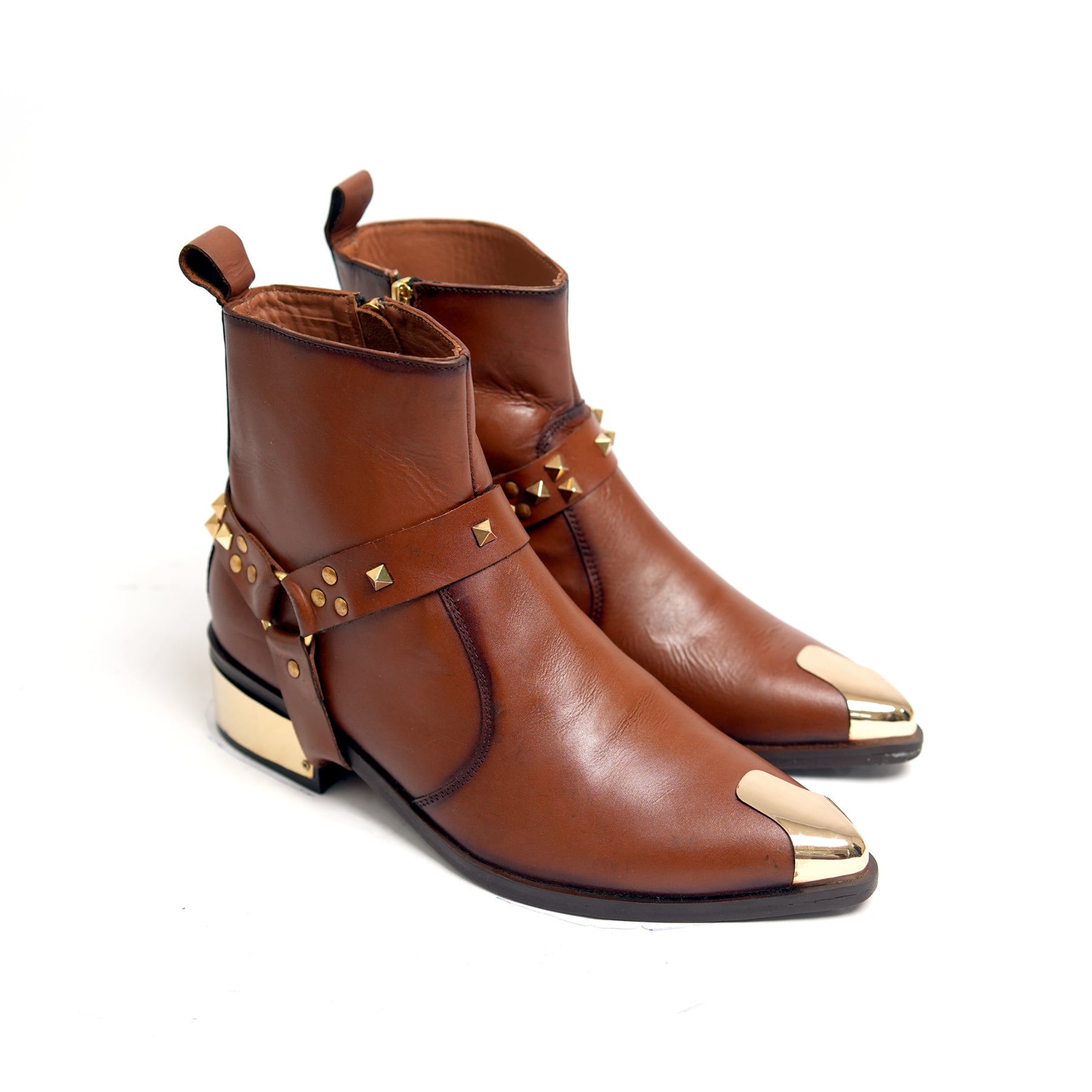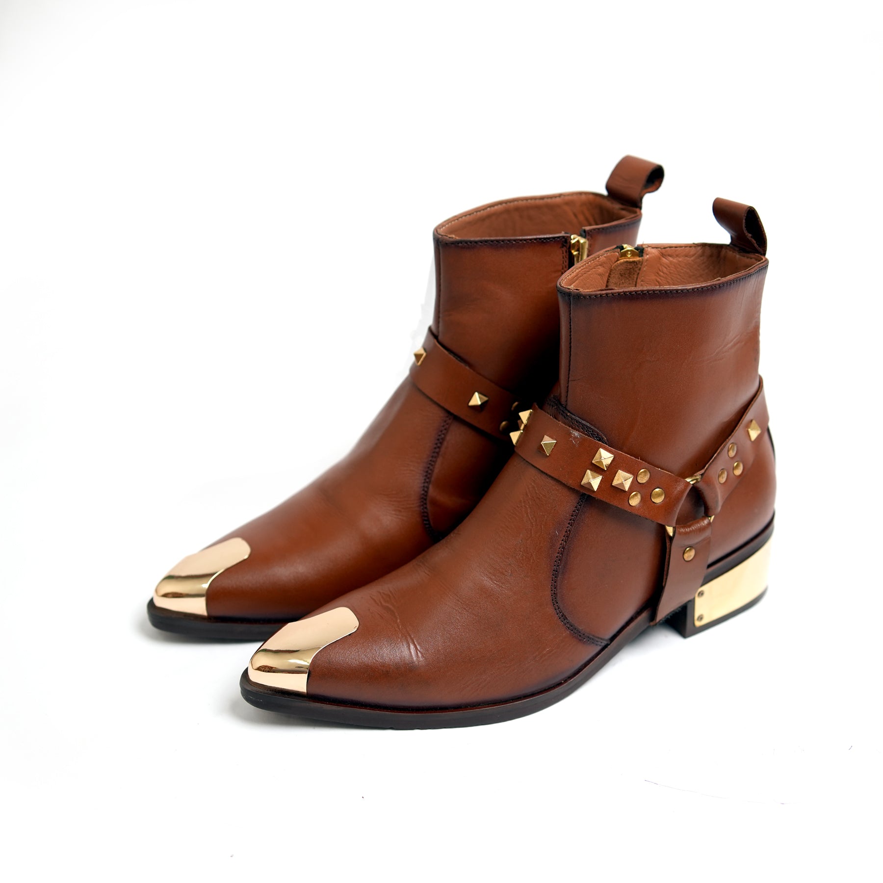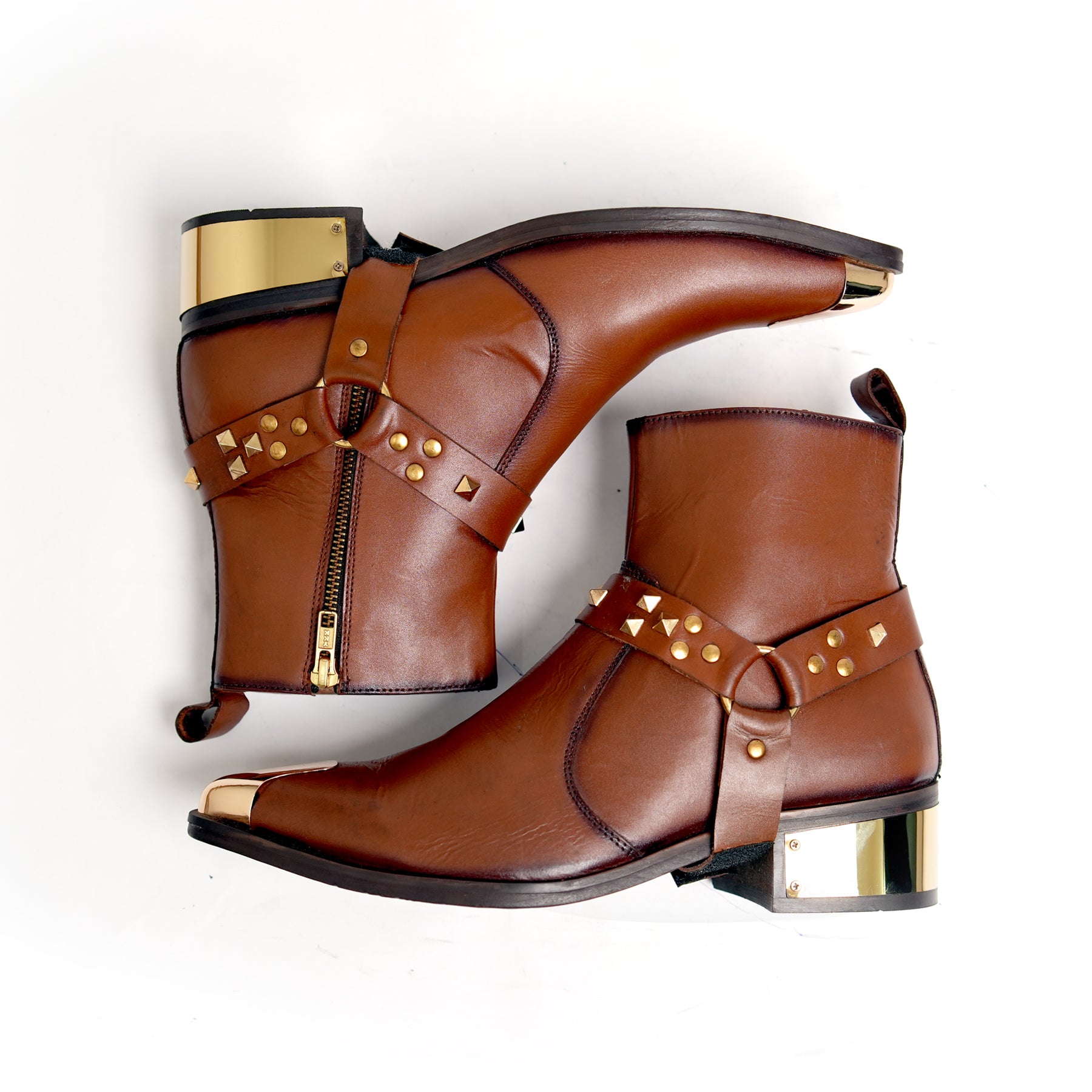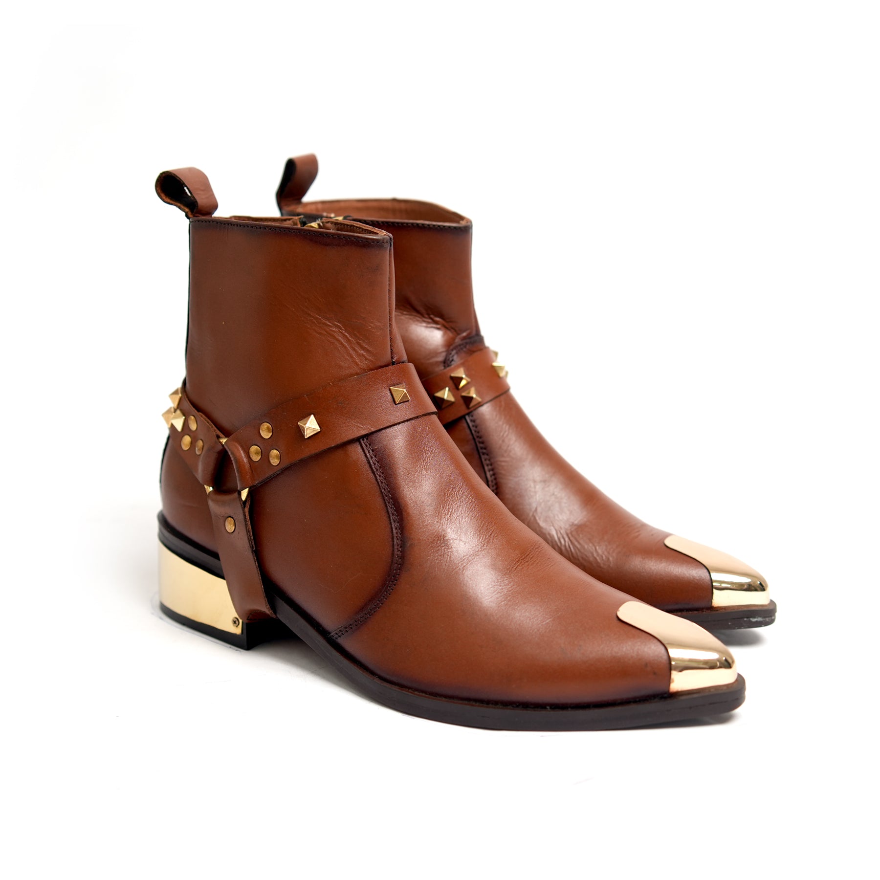 A bold fusion of classic leather and luxe metal, this ankle boot from Brogan Boots commands attention with gold-plated toe caps, studded straps, and a sleek side zip. Designed for edge and ease, it’s where street grit meets polished power.
